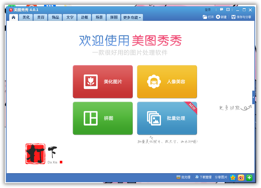 美图秀秀电脑版是美图官方推出的一款图片处理软件,相比于photoshop,美图秀秀更适合大众使用,操作比ps简单100倍,即使是电脑小白也可以用美图秀秀p图,一分钟即可p出影楼级的照片,美图、拼图、边框、饰品等功能一应俱全。